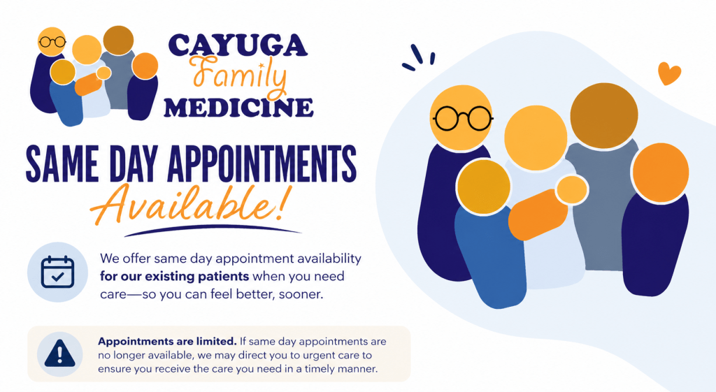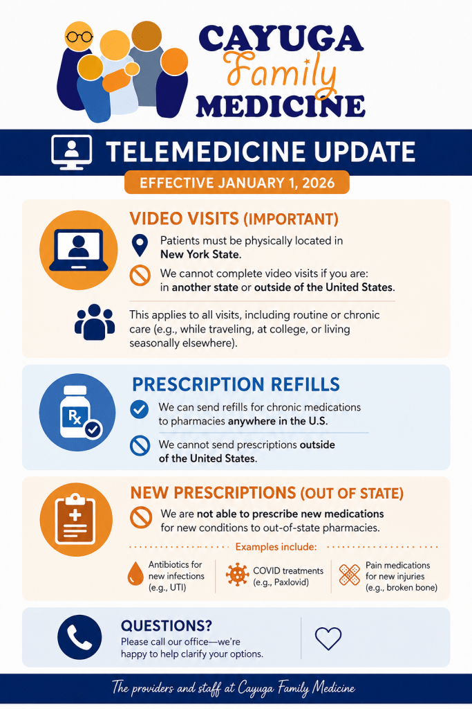 As of January 1, 2026, providers at Cayuga Family Medicine are ONLY able to do video visits IF the patient is physically in New York State. In other words, we will not be able to do video visits with a patient who is calling from a different state or outside of the United States. This includes any video visits for chronic medical care for patients who are out of town for prolonged periods of time, such as snowbirds or college students.